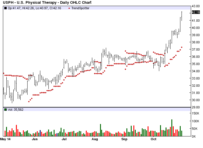 The Chart of the Day belongs to US Physical Therapy (USPH). I found the stock by sorting the All Time High list for the best technical buy signals then used the Flipchart feature to review the charts. Since the Trend Spotter signaled another buy signal on 10/13 the stock gained 14.61%.