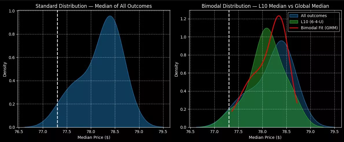 Under this condition, the expected 10-week median returns would shift to the left (toward zero). Moreover, price clustering would likely occur at $78.10. While there’s not much of a difference between the two distributions, investors should at least realize that the chance of upside is slightly less relative to baseline conditions.