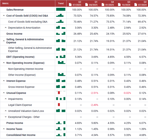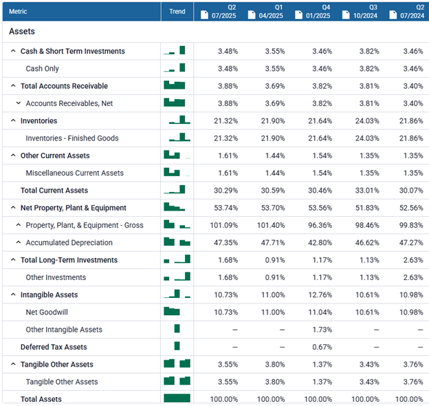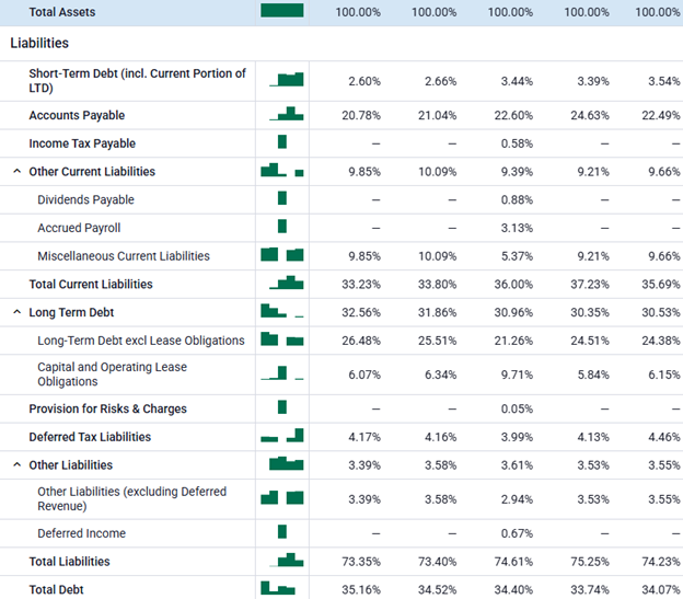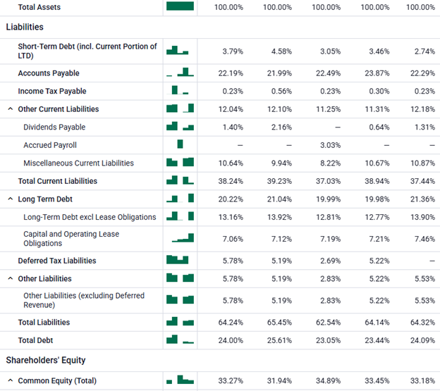 Here, each cash flow item, operating, investing, and financing, is shown as a percentage of total cash inflows or outflows. This helps you understand where the company’s cash is coming from and where it’s going, making it easier to spot trends in liquidity and capital allocation.