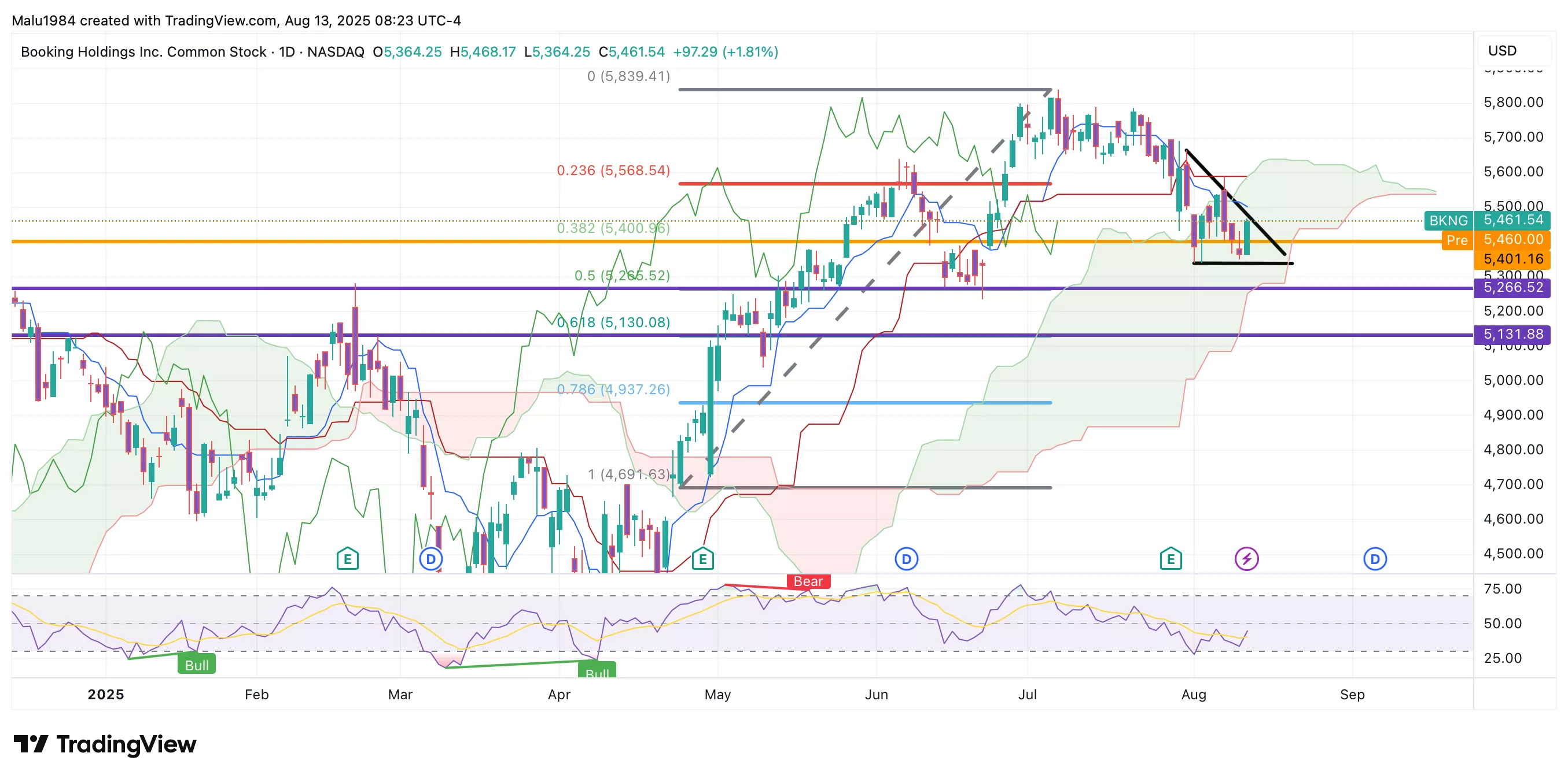 After hitting an all-time high of $5,836 on July 8, 2025, the stock dropped to $5,341 on August 1 and has been consolidating since.