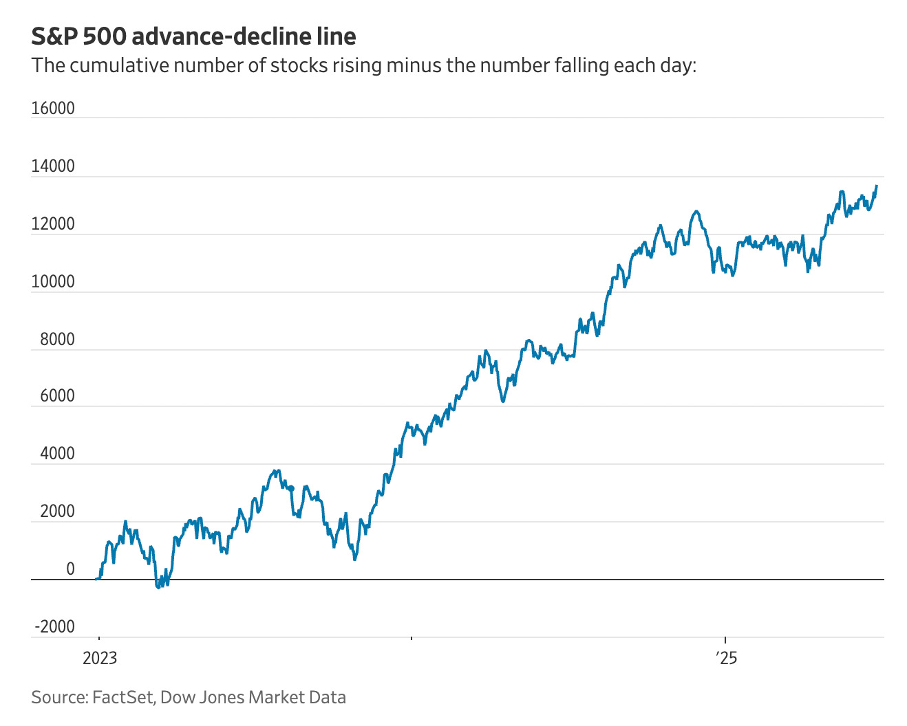 Market breadth measures are perking up like it’s pre-election Q3 all over again. Stocks above their 50-day moving average are climbing. Advancers are starting to outnumber decliners. It’s not exactly 2013, but it's enough to suggest we might be entering the “everyone gets a trophy” phase of the cycle. The kind where traders who missed the AI rocket look around and ask, “what else hasn’t gone up yet?”