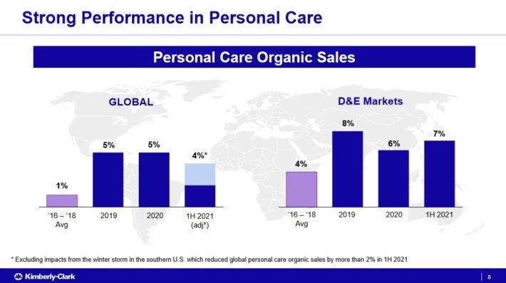 The company’s focus for D&E development is Latin America and China in particular, with smaller markets seeing a meaningful push as well. Kimberly-Clark plans to use its significant supply chain and marketing experience to pursue growth in areas where it under-performs today, and that should help drive some incremental growth.