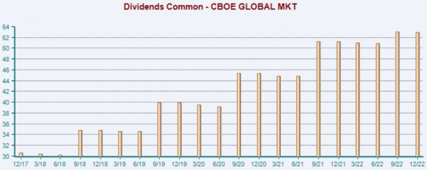 Impressively, the company has upped its dividend payout by nearly 14% over the last five years, reflecting a commitment to increasingly rewarding shareholders. CBOE’s annual dividend presently yields 1.4%, a few ticks below the Zacks Finance sector average.