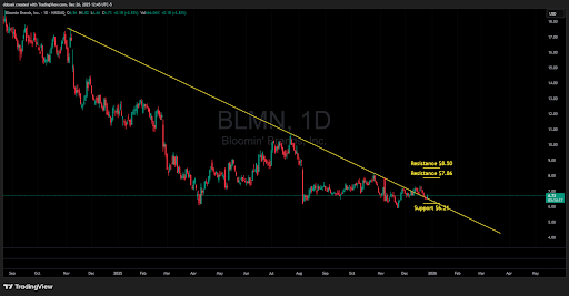 Looking at the charts, a notable technical shift occurred on December 11th, 2025, when BLMN finally broke above a long-term declining trendline that had been in play since November 2024. Following that breakout, price has now retraced to test the top of that very same trendline. While this setup often provides an attractive entry point for a bounce, we have to stay cautious; year-end tax-loss harvesting can often force positions closed and cause breakouts to sputter.