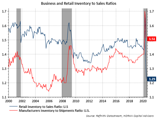 One significant difference in this recession versus prior ones is the fact it was not the result of excesses that had been built up in the economy. The virus mandated shutdown caught nearly everyone by surprise. As the reopening process has unfolded, businesses and suppliers do not have a large amount of excess product sitting around. The blue line in the below chart shows retail inventory to sales. As sales have increased, the denominator of the ratio, it shows inventory has not kept pace with the higher sales activity. The result is more production on the horizon to replenish lower inventory levels; thus, a positive contribution to economic activity. The red line is manufacturing inventory to shipments at 1.51 to 1.0 and down from 1.65 to 1.0 in May. Manufacturers seem to have anticipated the higher shipment levels and actually have built some inventory slightly.