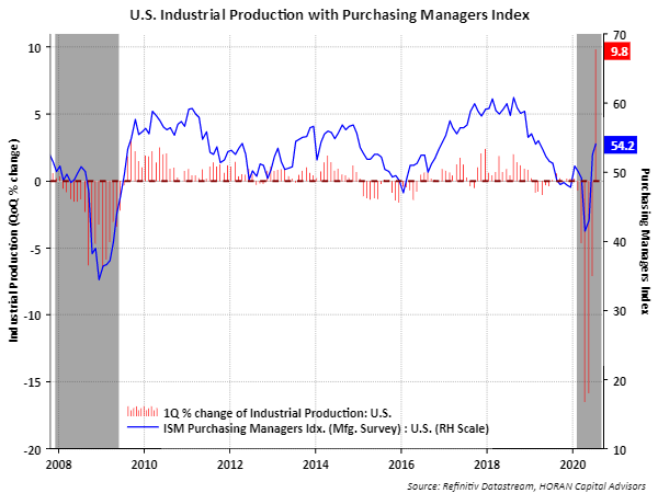A few other areas on the manufacturing side of the economy confirming this increased activity is the ISM Purchasing Manager Index at 54.2, a reading above 50 signals expansion in manufacturing. This is a sharp recovery from the low of 41.5 in April. Also reported today was industrial production and capacity utilization. For the month of July, the indexes for all of the industrial production market groups increased. On a quarter over quarter basis industrial production rose 9.8%. This growth in manufacturing output is further evidence of a recovery in the manufacturing portion of the economy.