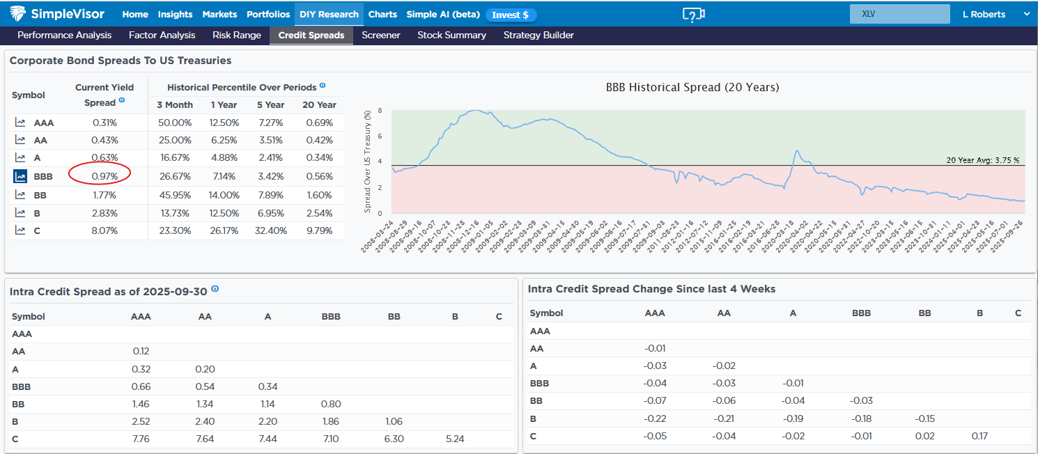 We have previously discussed how corporate bond yield spreads to US Treasuries are historically tight. Today, we add some math to that argument to help appreciate the risk/reward facing some corporate bond investors. The table below, courtesy of SimpleVisor, displays the current yield spreads of various credit-rated corporate bond indexes relative to US Treasury yields. As shown under the heading “Historical Percentile Over Periods”, they are very close to the lowest levels of the last 20 years.