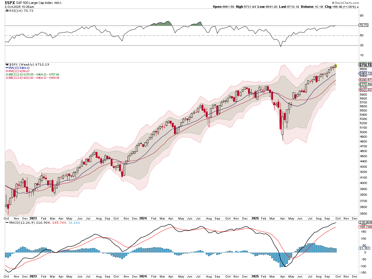 With the market significantly extending above the 13- and 21-week moving averages, a reversal to those support levels should be anticipated. While always difficult, the timing makes it challenging to navigate very complacent markets. However, the crucial note is that the number of ingredients for a correction of some sort is increasing, suggesting that risk management is becoming more essential. However, with that said, corrections should be bought for now as we head into year-end.