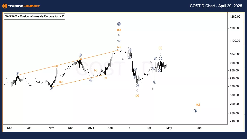 Costco’s daily Elliott Wave structure suggests the completion of wave (B) close to the psychological resistance level at $1000. If this holds, it sets the stage for wave (C) to begin on the downside. This movement would align with the ongoing larger correction under wave 4.