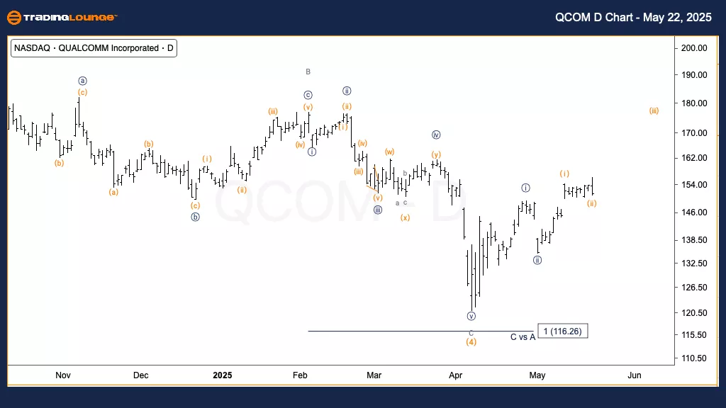 Qualcomm (QCOM) is consolidating close to the $150 mark, a crucial medium-level resistance. The Elliott Wave analysis suggests wave (ii) is concluding within a larger wave {iii}. If the price sustains above this level, it could validate the bullish scenario and launch an impulsive move into wave (iii) of {iii}. This outlook supports further upward movement in the near term, provided price action confirms the structure.
