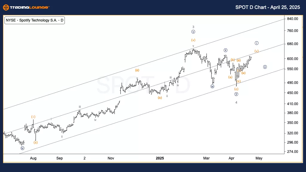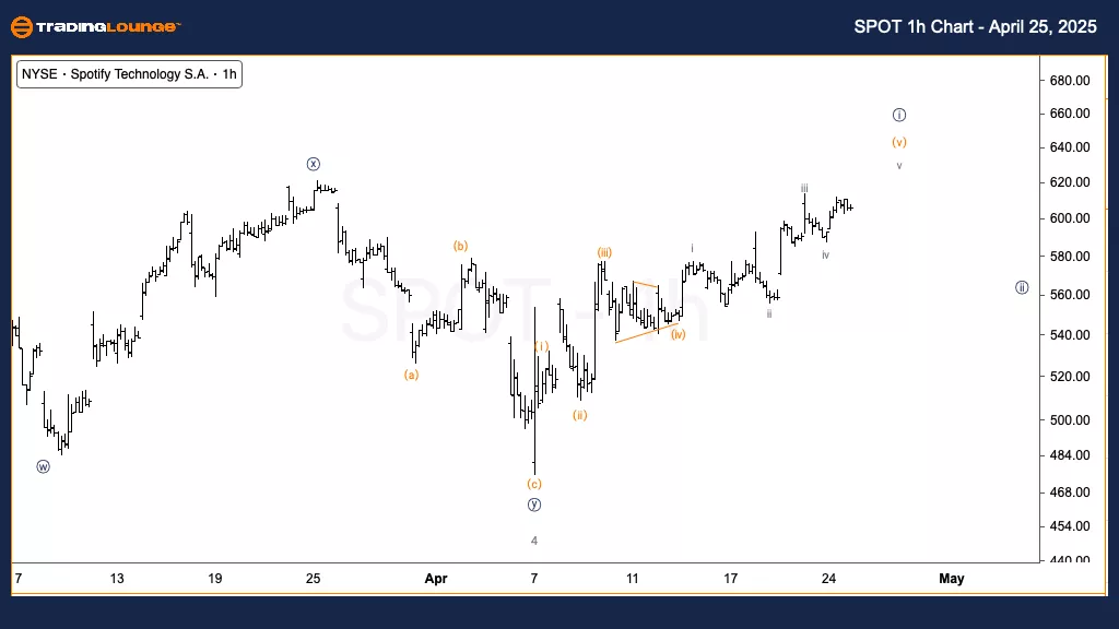 The intraday analysis of SPOT shows that it is advancing through wave (v) of Minute wave {i}. This move suggests a final push higher may still be pending. However, as the price nears the $650 level, a potential resistance zone, a brief pause or a corrective phase could develop. Upon completion of this five-wave sequence, a retracement in wave {ii} may follow.