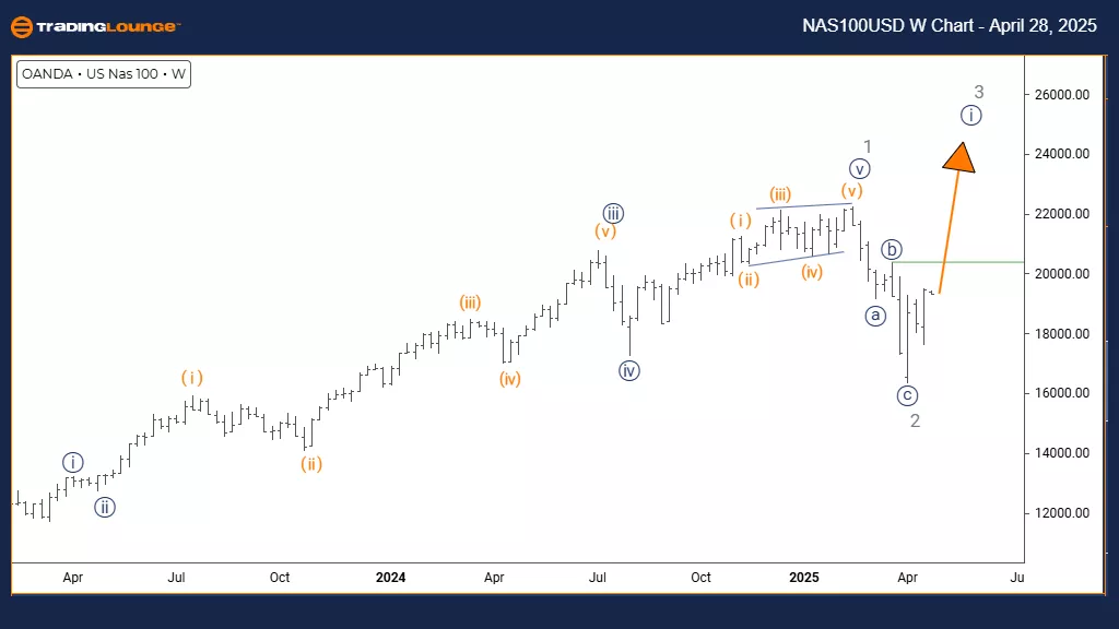 The Nasdaq weekly chart analysis shows a bullish trend taking shape through an impulsive Elliott Wave structure. The index has finished the gray wave 2 correction and transitioned into navy blue wave 1, part of the larger gray wave 3 formation. This setup points to the early stages of what could evolve into a strong impulse wave with substantial upside potential over the coming weeks.