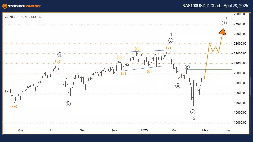The Nasdaq daily chart analysis highlights a bullish trend forming through an impulsive Elliott Wave structure. The index has finalized the gray wave 2 correction and transitioned into navy blue wave 1 within the broader gray wave 3 formation. This setup signals the early phase of a new impulse move that could drive strong upside momentum over the upcoming sessions.