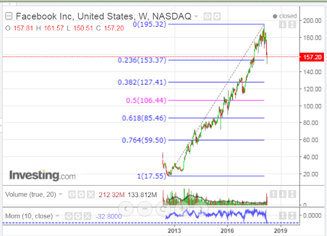 Meanwhile FB is hovering above its very long-term 23.6% Fibonacci retracement level of 153.37, after being broken twice during the past two weeks, as shown on the following weekly chart. A break and hold below that level could send it down to its next major Fib support level at 127.41, or lower.