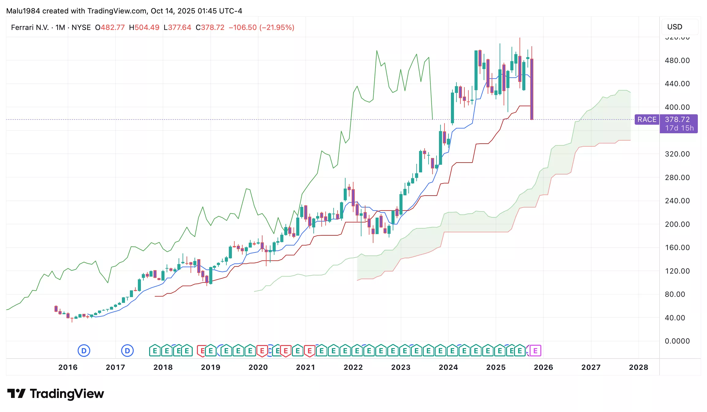 No major reversal patterns are visible on the monthly chart, suggesting that despite the recent correction, Ferrari’s structural uptrend is still valid.