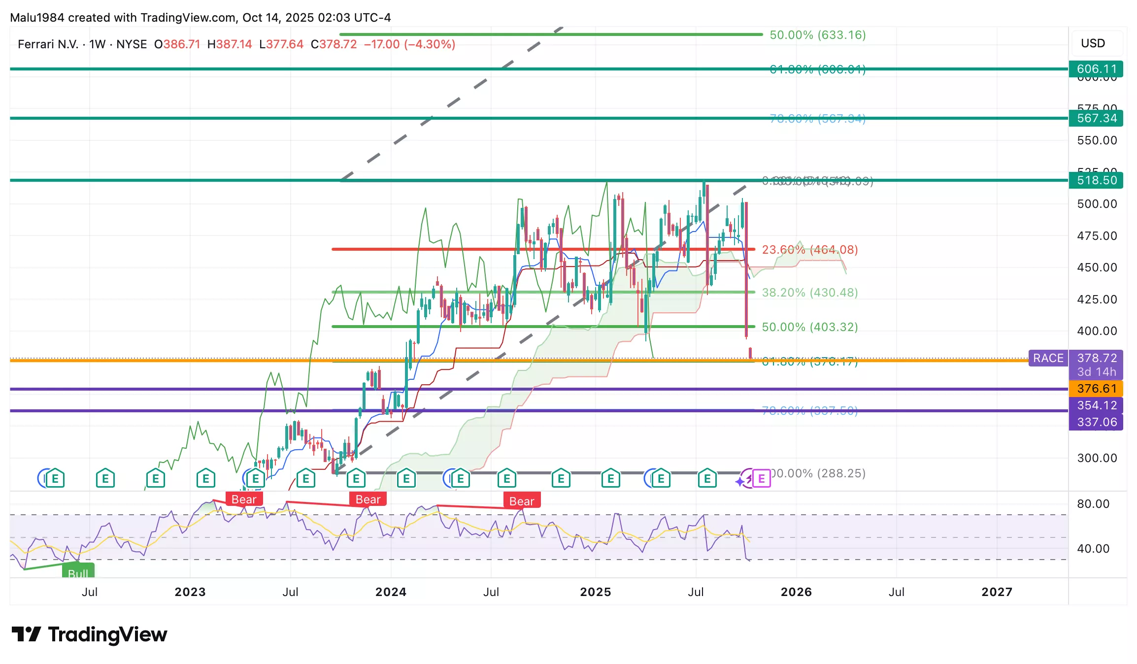 However, RSI readings near 28 indicate oversold conditions that could trigger a relief bounce if buying volume returns. The long-term trend on the monthly chart remains intact, but in the near term, Ferrari will need to reclaim the 403–430 zone to signal stabilization and shift momentum back toward recovery.