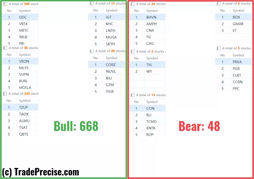 The bullish vs. bearish setup is 668 to 48 from the screenshot of my stock screener below.