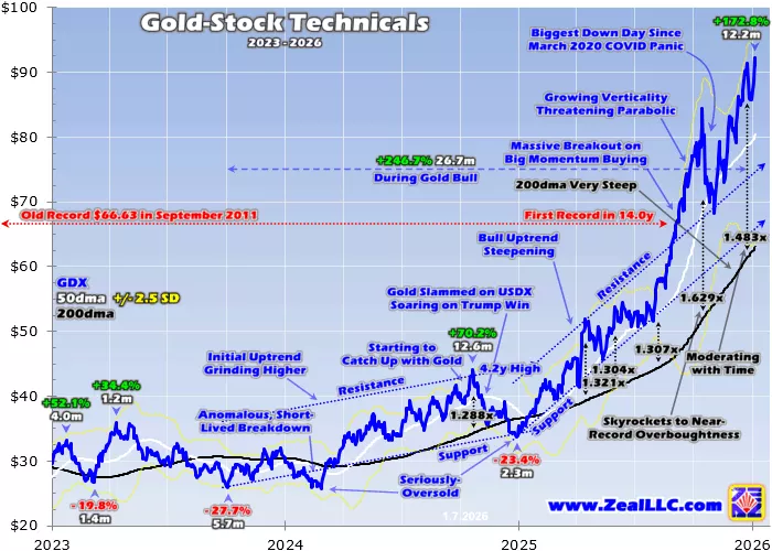 While analyzing today’s extreme gold-stock technicals is beyond the scope of this fundamental essay, check out this GDX chart. This dominant gold-stock benchmark has not only skyrocketed 173% in just over a year, it is stretched nearly 50% above its baseline 200-day moving average! Technically gold stocks are as extreme as they’ve ever been in GDX’s entire history, crazy-overbought and due for a major rebalancing.