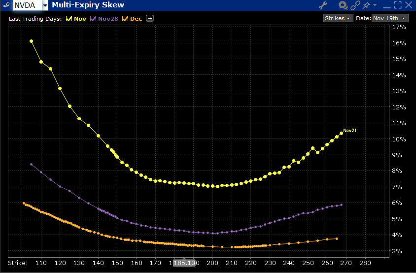 Skews for NVDA Options Expiring November 21st (yellow), November 28th (purple), December 19th, 2025 (orange)