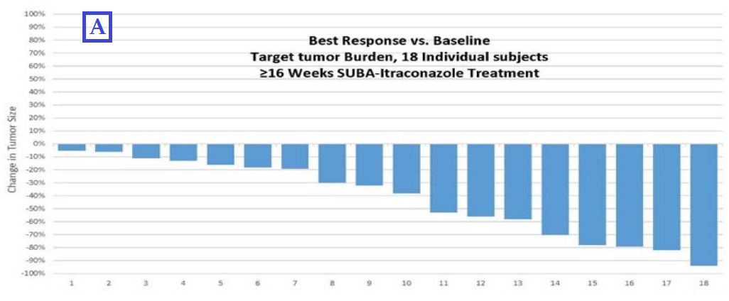 Waterfall plots for (A) and (B) can be viewed here and here, respectively, and are quite impressive. Updated data recently submitted to the U.S. FDA in request of the Type C meeting show equally impressive results. Included in the summary analysis are data for 35 patients enrolled in the trial relating to reduction in target tumor burden, safety, and time on study. Management noted in its meeting request to FDA that all patients on SUBA-Cap therapy had some degree of measurable target tumor burden decrease with a median time on study of 32 weeks and a dropout rate of only 11%. Importantly, this interim analysis shows 97% of patients (34 of 35) avoiding surgery with 37% achieving a 30% or greater reduction in target tumor burden and complete disappearance of 28% of target lesions.