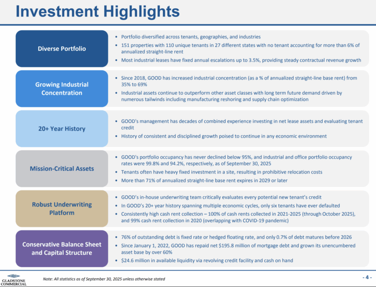 Key risks include higher interest rates and challenges in the office sector. For investors, Gladstone’s appeal lies in reliable income and incremental portfolio growth rather than rapid expansion.