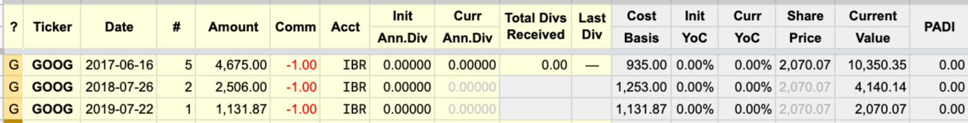 I first opened a position in GOOG on 16 June 2017, paying $935 per share for five shares. Since then, I've added three more shares on two other occasions. GOOG is a growth stock that does not pay dividends. I call GOOG and the few other growth stocks in my portfolio that don't pay dividends, my future dividend growth stocks.
