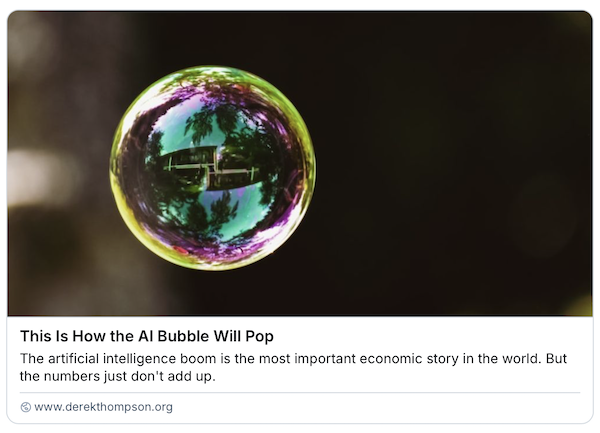 How do you measure a bubble? Derek Thompson, with the help of Paul Kedrosky, notes, “Total AI capital expenditures in the U.S. are projected to exceed $500 billion in 2026 and 2027—roughly the annual GDP of Singapore. But The Wall Street Journal has reported that American consumers spend only $12 billion a year on AI services. That’s roughly the GDP of Somalia. If you can grok the economic difference between Singapore and Somalia, you get a sense of the economic chasm between vision and reality in AI-Land.”