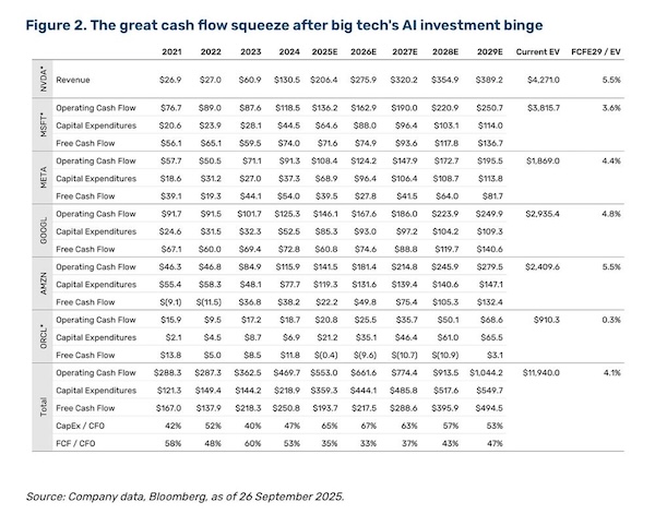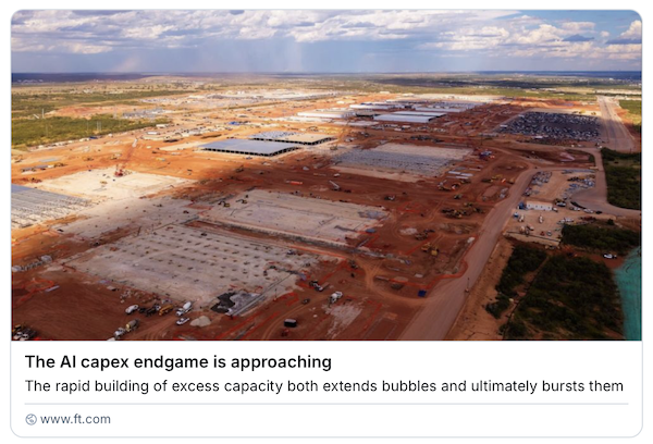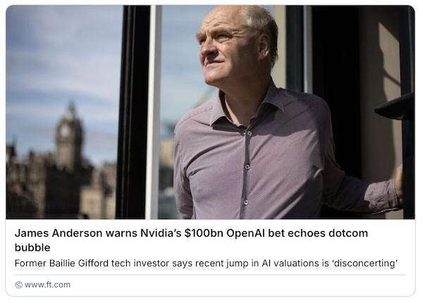 In some respects, the AI bubble is similar to the dotcom bubble of 25 years ago. As James Anderson tells The Financial Times, “I have to say the words ‘vendor financing’ do not carry nice reflections to somebody of my age. It’s not quite like what many of the telecom suppliers were up to in 1999-2000 but it has certain rhymes to it.”