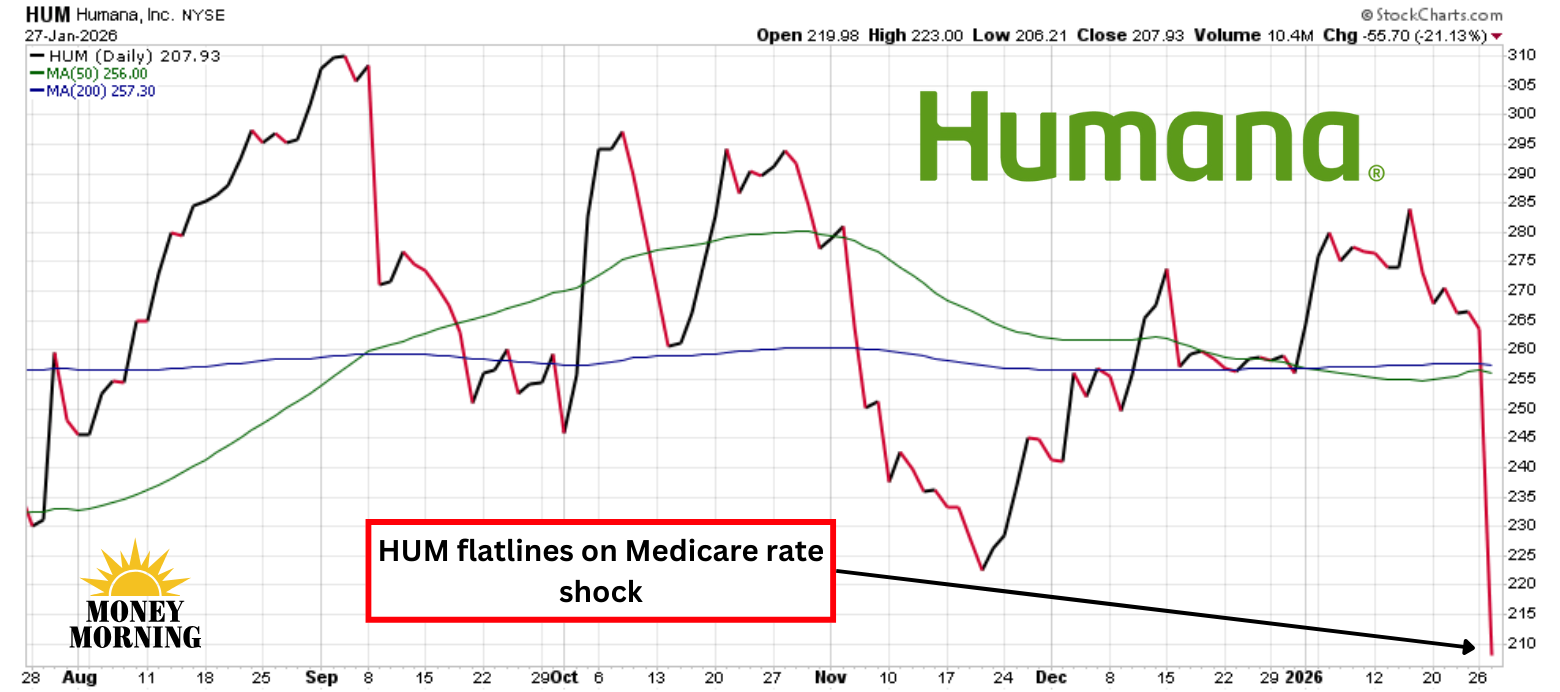 Humana (HUM) investors may have suffered cardiac arrest yesterday after shares of the health insurer cratered 21% to close below $208 – the lowest level since early 2017. This brutal selloff erased billions in market value and helped drag down the entire managed care sector, with rivals like UnitedHealth (UNH) tumbling 19% and CVS Health (CVS) dropping 13%.