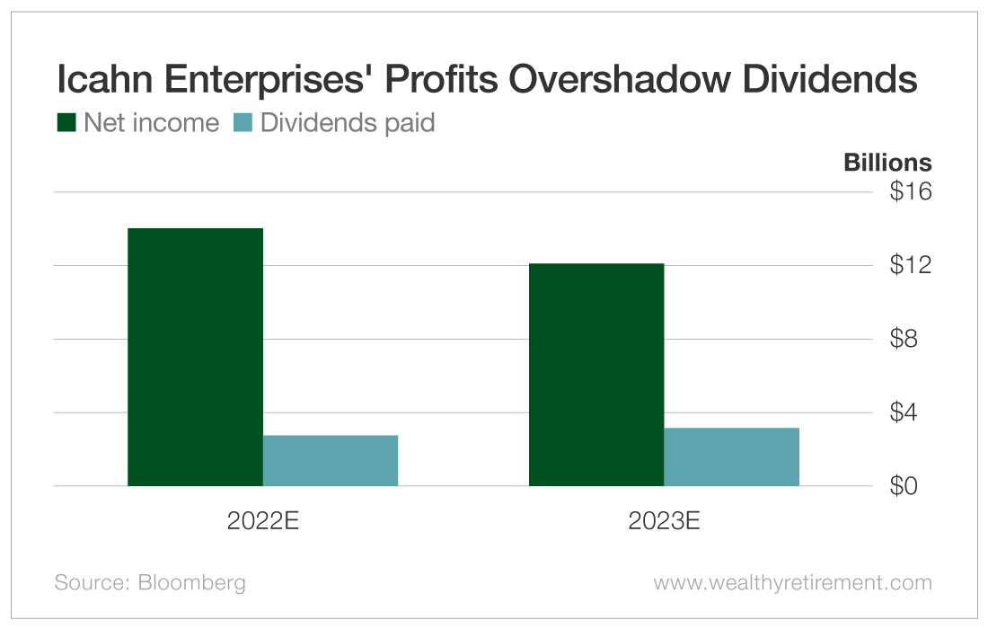 In 2022, Icahn Enterprises will likely pay out $2.7 billion in dividends, which is just 19% of its profits. Next year, that figure is forecast to rise to $3.05 billion, giving it a payout ratio of 25%. That is quite low and makes me comfortable that Icahn Enterprises can easily afford its dividend.
