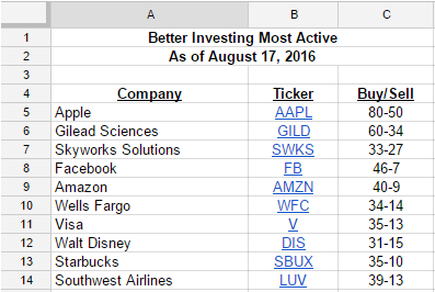 The new additions are Wells Fargo (WFC) and Southwest Airlines (LUV). Apple (AAPL) has remained at the top of the list as far back as January 2015. Below is the most recent active list.
