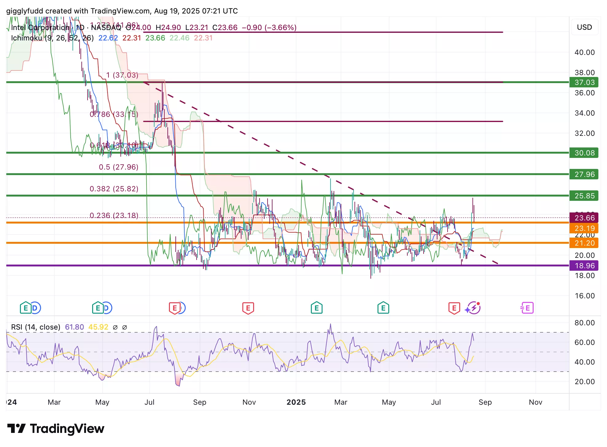 This was tested in January 2024, when Intel rebounded but failed to break above the cloud, signaling that downward momentum is still in play. The RSI is improving from oversold levels but hasn’t yet turned fully bullish.