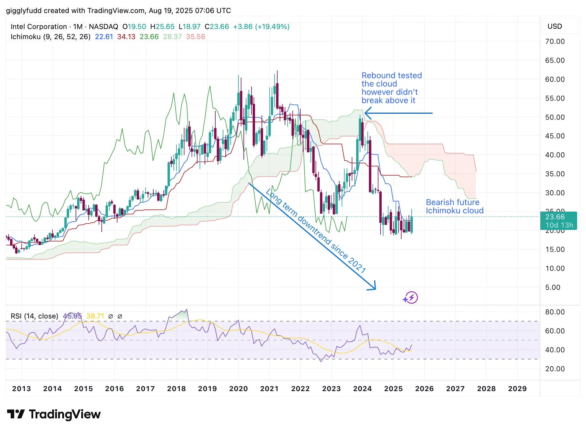 Intel has been in a long-term downtrend since 2021, with sharp rebounds of up to 78% in between.