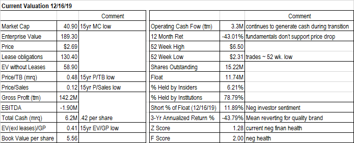 Summary comments on the table above include the obvious fifteen-year low valuations. The current market capitalization of 40.90 million compares favorably to 142.20 million in trailing twelve months of gross profit, 335 million in sales, 81.90 million in equity, 6.20 million in cash, no debt or credit line borrowings. The current tangible and intangible value does not reconcile with negative -43.01% twelve-month stock return trading near a 52-week low for a successful differentiated brand name retailer. Also note the negative attributes of the Z and F score.