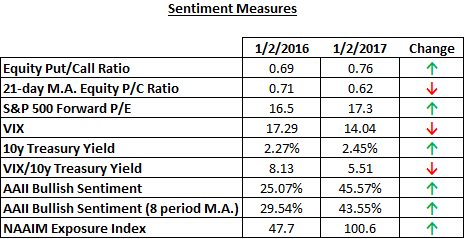 In 2015 investors had to contend with a very volatile equity market during the summer months. On August 24, 2015 the Dow fell 1,000 points intraday before closing down 588 points. This volatility extended into October with the end result, the S&P 500 Index was up only 1.4% for all of 2015. This level of volatility and flat returns left investors anything but bullish going into 2016. As fate would have it, investors faced another market decline to begin 2016 as the S&P 500 Index fell 11.4% before bottoming on February 11, 2016. Fast forward to the end of 2016, and after an equity market that returned 12.0% for this past year (S&P 500 Index), broad measures of investor sentiment are much less fearful as 2017 begins as can be seen in the below chart and raises the question whether much of near term returns are already priced into the market.