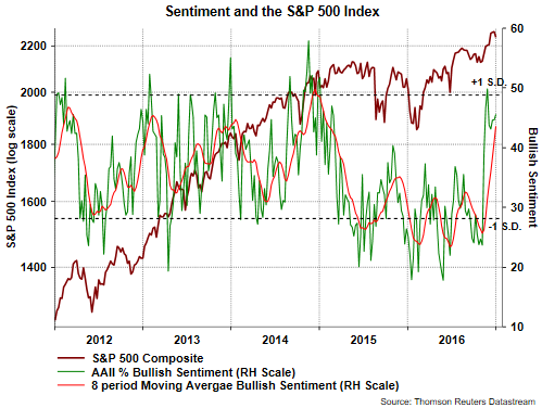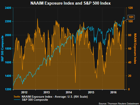 The evaluation of the bottom three indicators in the above chart leads one to possibly conclude individual investors (AAII) and fund managers (NAAIM) just might already be positioned for strong equity returns in 2017. As noted on NAAIM's website, the NAAIM Exposure Index represents member firms who are active money managers and are asked each week to provide a number which represents their overall equity exposure at the market close on a specific day of the week, currently Wednesdays. Responses are tallied and averaged to provide the average long (or short) position of all NAAIM managers, as a group. A reading of 100 for the average indicates managers are fully invested.