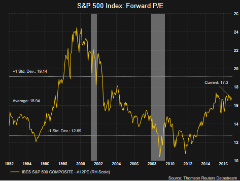 In conclusion, investors seem to have a broadly favorable view of the markets going into 2017 and this may be the reason for some caution. I believe some of this optimism is based on anticipated pro-growth business policies that may be implemented under a Trump administration. The key factor is a Trump administration is not in office yet and the exact policies that make it through Congress are unknown. From a positive standpoint, S&P 500 year over year (YOY) earnings have turned positive as reported by Thomson Reuters with actual Q3 2016 earnings up 4.3%, ex-energy S&P 500 earnings up 7.9%. Q4 2016 earnings are expected to be up 6.2% and Q1 2017 earnings up 14.1%. This accelerating growth rate in earnings should certainly be positive for stocks with valuations just slightly above average.