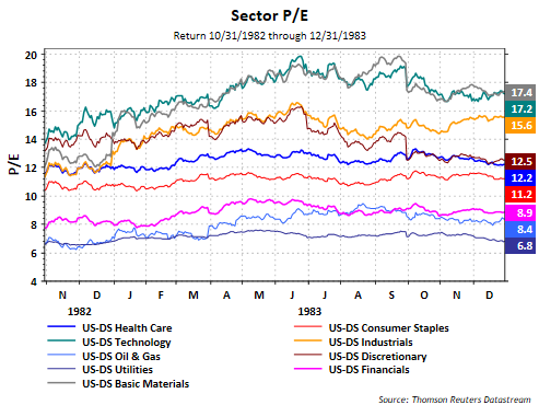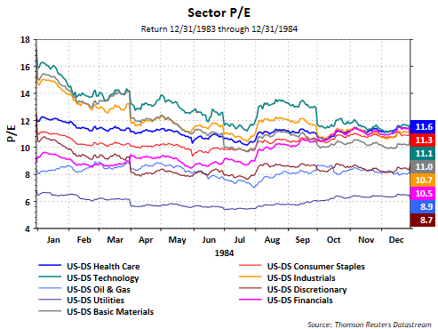 A significant difference today versus the early 1980's is sector valuation. Below is the trailing P/Es for the sectors in 1983 and 1984. The last chart is the forward P/E today.