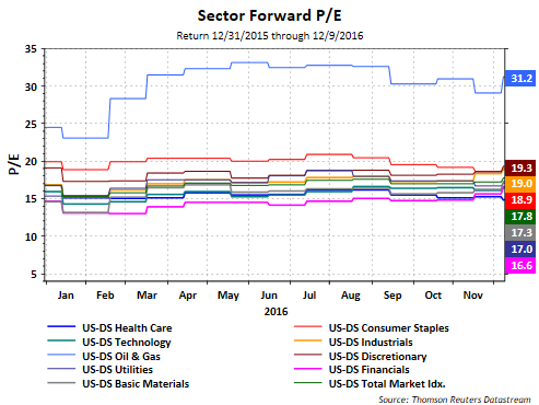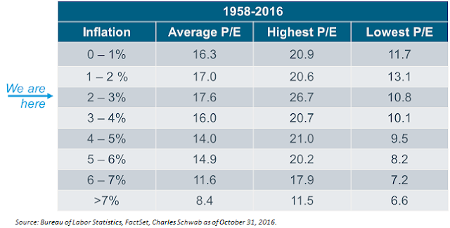 Over the last two years inflation has averaged just slightly more than half a percent, with the latest inflation reading just under 2%. If one believes there is some validity to the Rule of 20, then stocks currently are neither overvalued nor undervalued. If potential Washington policies result in faster economic growth, then anticipated earnings growth would be supportive of current valuations.