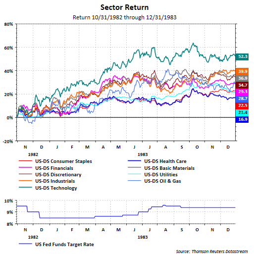 In 1984, utilities had strong returns in the back half of 1984 as the Fed's target rate declined and making it the best sector performer in 1984. Staples and financials also outperformed while materials, technology and industrials lagged.