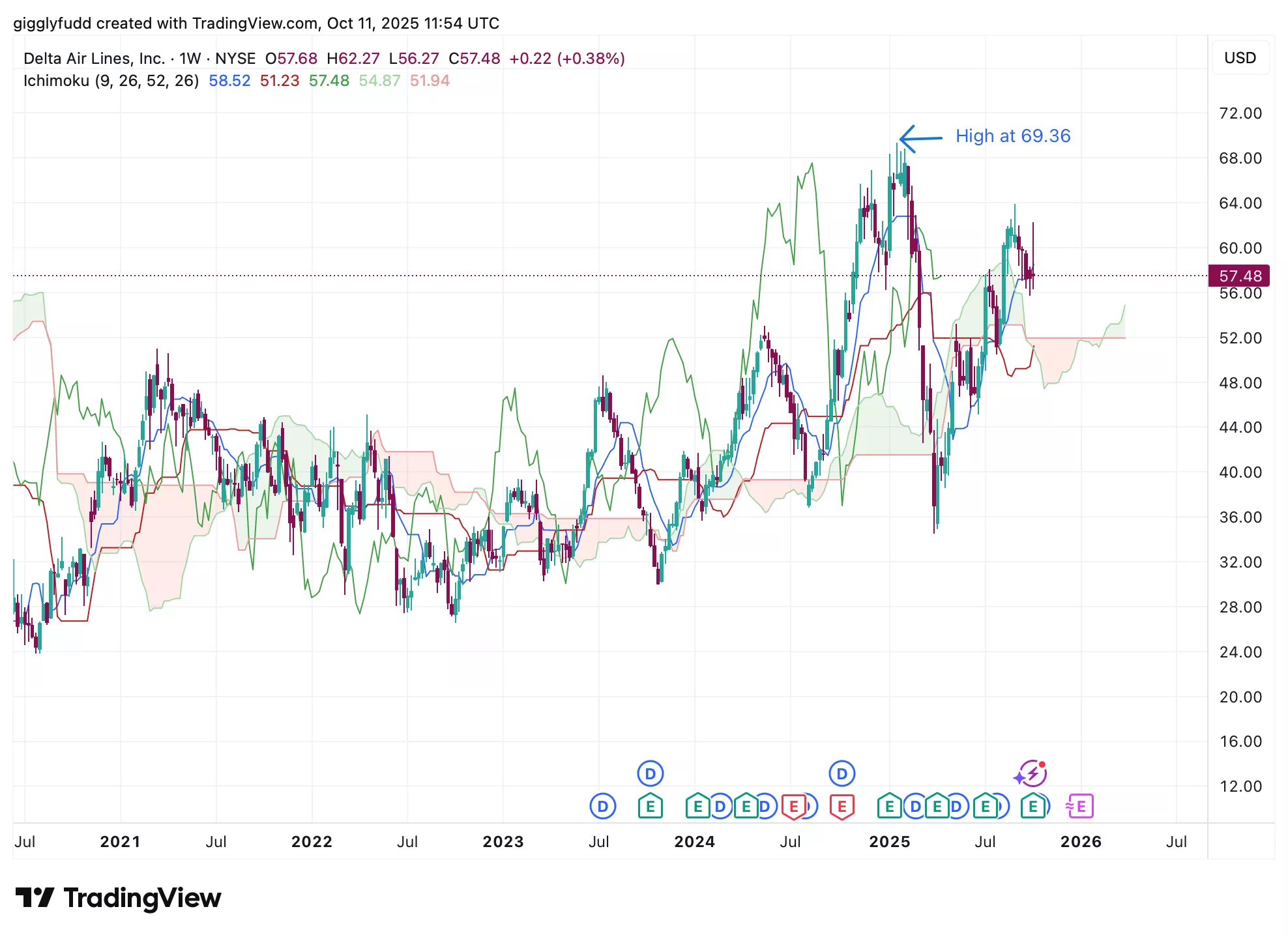 On the weekly chart, DAL’s price pattern appears cyclical and choppy, moving through alternating uptrends and downtrends roughly every 3 to 8 months. In January 2025, the stock reached a new high of $69. Currently, it remains in an uptrend, with the future cloud still showing bullish signals and candlesticks holding above the cloud, suggesting that the upward bias is intact.