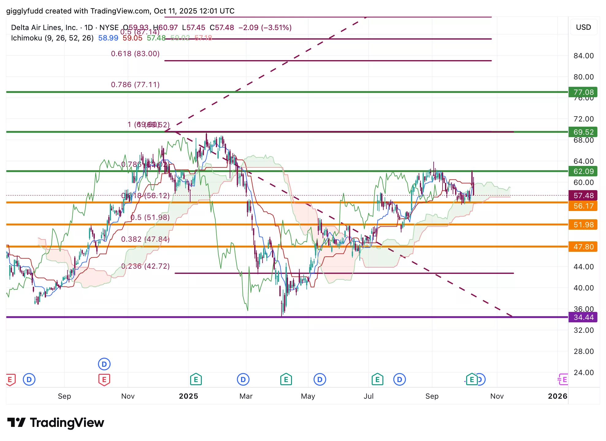 However, as a cyclical business, Delta still faces challenges such as rising labor costs, slower business travel recovery, and potential margin pressure as competitors rebuild capacity. Technically, the long-term trend remains bullish, though recent price action shows signs of consolidation, suggesting possible short-term weakness if support levels fail to hold.