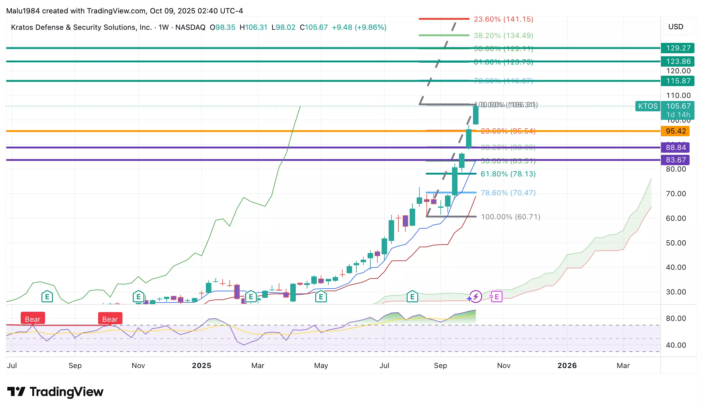 KTOS shows strong bullish momentum, but the RSI above 90 signals the stock may be overheated. While the long-term trend is intact, short-term volatility or a healthy pullback is likely before the next move higher.