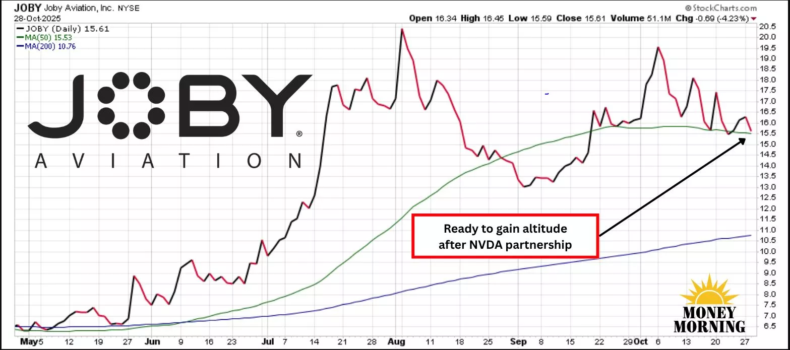 Electric vertical takeoff and landing (eVTOL) aircraft pioneer Joby Aviation (JOBY) is gaining altitude in premarket trading this morning after announcing a groundbreaking collaboration with Nvidia (NVDA) that positions the eVTOL leader as the exclusive aviation launch partner for the AI chipmaker's new IGX Thor platform. JOBY stock is up nearly 6% after having jumped more than 8% on the news.