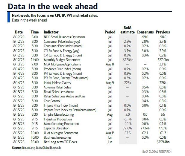 As we move into mid-August, markets are bracing for a surprisingly busy week, with several key events and data releases likely to shape sentiment; of these, the most closely watched will be tomorrow’s US CPI report, which after the last week of July which had both the jobs report and the Fed meeting, could prove to be one of the larger events of the summer for markets, according to Deutsche Bank's Peter Sidorov.