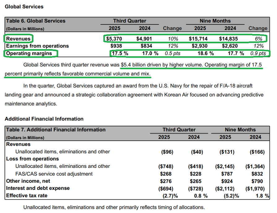 6) The Global Services segment delivered quarterly revenue of $5.4B, up 10% YoY from $4.9B. The segment booked $8B in orders during the quarter, bringing the YTD book to bill ratio to 1.2 and pushing backlog to about $25B. Profitability remains strong, with operating margins of 17.5%, up 50 bps YoY, and both the commercial and government businesses again delivering double digit margins.