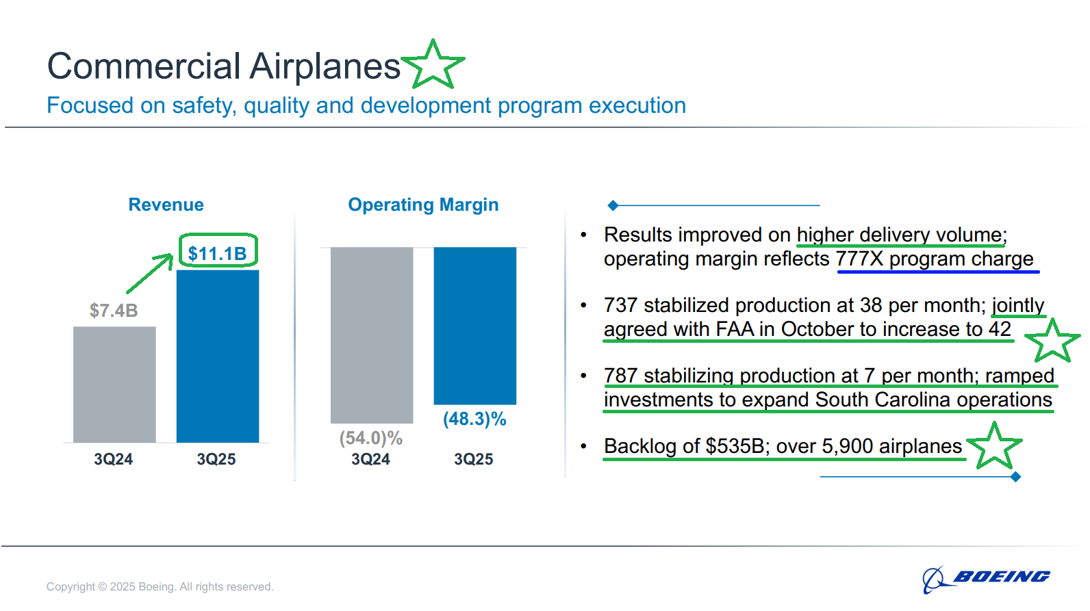 3) After stabilizing production at 38 per month and meeting all required KPIs, Boeing jointly agreed with the FAA in October to increase 737 MAX output to 42 per month. Management expects to exit the year firmly at a 42-per-month rate and sees no supply chain constraints that would prevent further increases. Any production hikes beyond 42 per month will occur in increments of 5, no sooner than 6 months apart, and will use the exact same review process with the FAA.