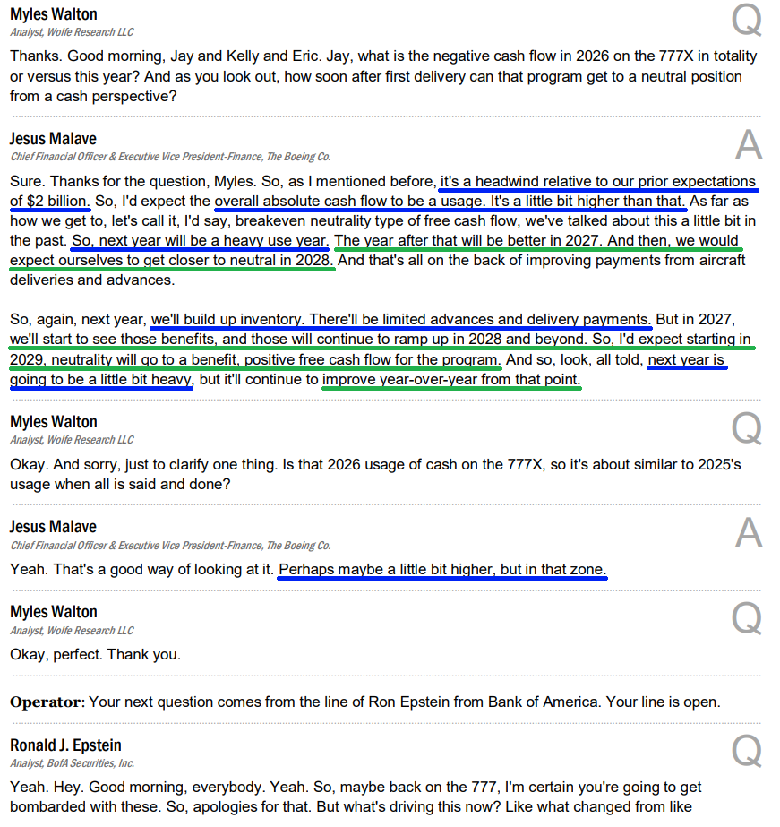 7) Management recorded a $4.9B charge tied to the updated 777X certification timeline, which increased quarterly loss per share by $6.45. While there are no major technical issues with the airplane or its engine, authorization to begin the next major phase of certification flight testing has been delayed, pushing the expected first delivery to 2027 instead of 2026. Management noted that demand for the aircraft remains strong and that they view the 777X as the company’s next flagship, with the charge serving as a conservative estimate that could allow them to beat the updated timeline. The program is expected to be a free cash flow headwind of about $2B in 2026, with improvements in 2027 and cash flow neutrality by 2028, followed by positive contributions thereafter.