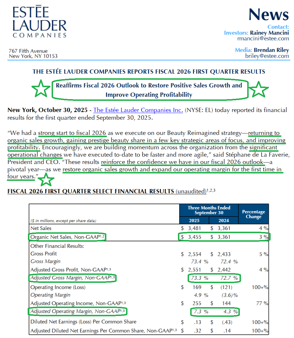 1) Estée Lauder (EL) reported Q1 revenue of $3.48B, up 4% YoY and ahead of consensus by ~$98.6M. Organic growth was 3%, a massive sequential acceleration from the 13% decline in Q4. Adjusted EPS of $0.32 also beat expectations by $0.14 and more than doubled versus the prior year period.