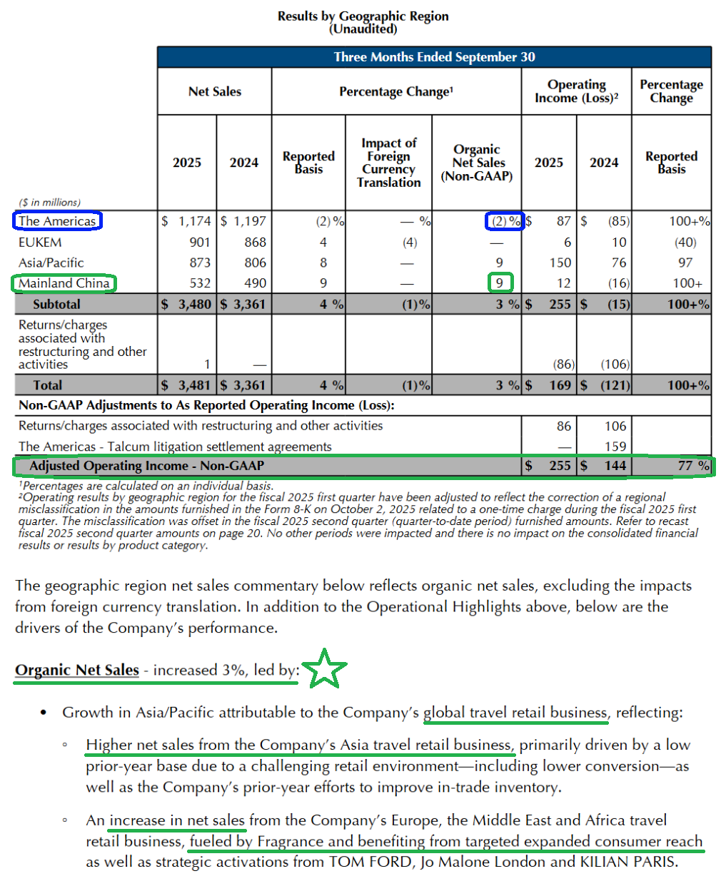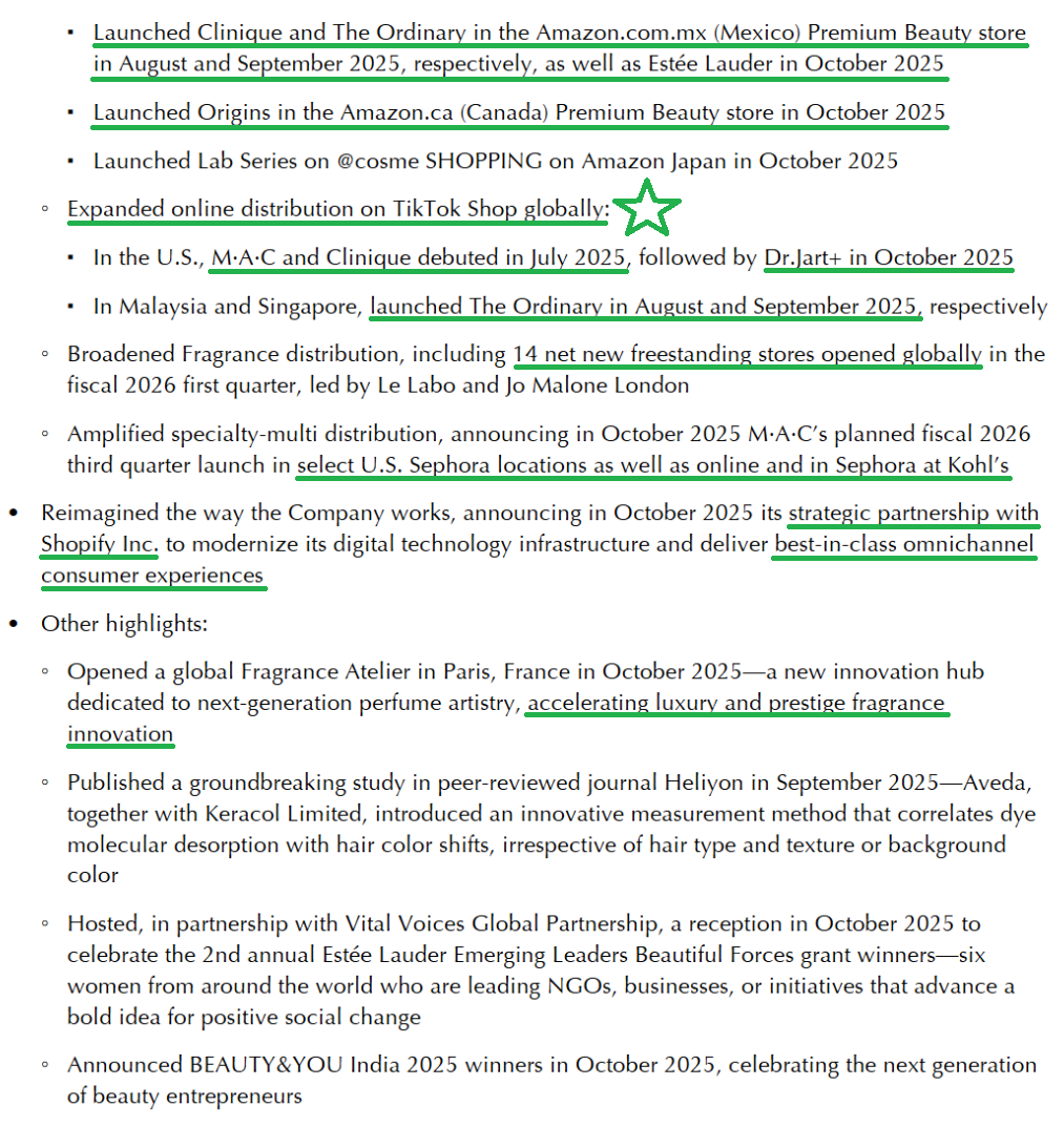 3) The Americas saw net sales decline 2% to $1.17B, pressured by ongoing challenges in department stores and softness at certain retailers with elevated inventory levels. That said, Estée Lauder has maintained prestige beauty share year to date, with meaningful volume driven share gains in the US. This was led by the Estée Lauder brand, which gained share across skincare, makeup, and fragrance for the brand’s third consecutive quarter of overall share gains.